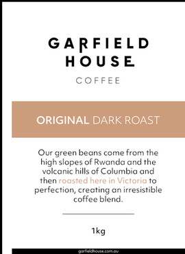 Garfield House Dark Roast available in 1KG bags Beans as well as Espresso and Plunger grinds.